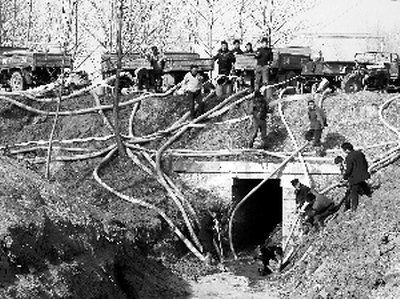 而在引水渠不到30米的水邊,已擁擠著13輛拖拉機(jī)和奔馬車。大家爭著把水泵往水里放,“水泵緊挨著水泵?!?/P>