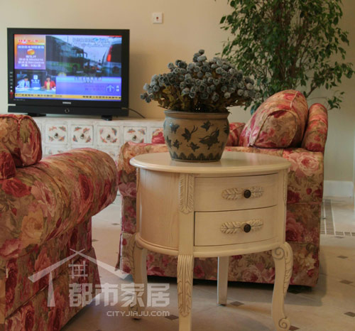 和玄關(guān)不同,客廳呈現(xiàn)出明顯的西式風(fēng)格。粉色花朵圖案的沙發(fā)有著甜膩膩的女性氣質(zhì),讓人聯(lián)想起女主人熱情的邀請(qǐng)和溫柔的款待。白色的雕花小矮柜氣質(zhì)優(yōu)雅,它的白色調(diào)和了沙發(fā)的甜膩感,給人眼前一亮的感覺(jué)。電視柜則像是沙發(fā)和小矮柜的中和品,有著白的底色和粉粉的手繪圖案。這一切搭配在一起散發(fā)出歐式田園的浪漫感覺(jué)。