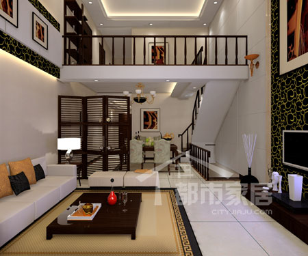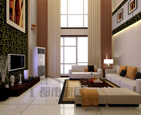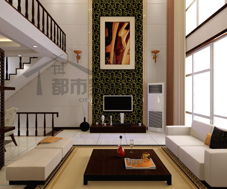 兩面背景墻的對照很強烈,烘托出恢弘的效果。電視背景墻從上至下整個用印花壁紙包覆,正中配一幅巨大的藝術(shù)畫。沙發(fā)背景墻的裝飾雖然面積小得多,但是凌駕于半空之中,有種高高在上的氣勢,和在沙發(fā)背后低低地掛兩幅小畫的裝飾手法相比,一個是莊重大氣的,另一個則是柔和輕松的,并沒有好壞之分,關(guān)鍵還是在于主人的喜好。