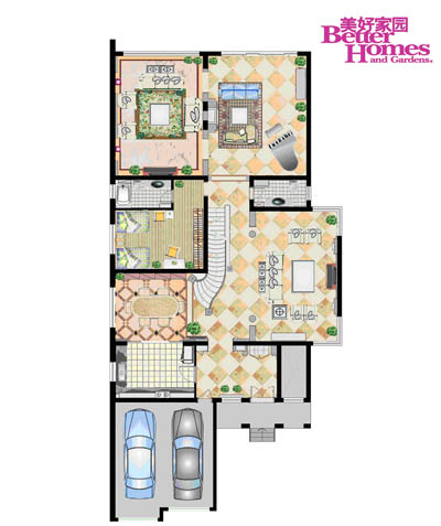 圖1:客廳的硬裝基礎(chǔ)氣質(zhì)硬朗,所以在家具的造型、壁紙的圖案、窗簾的形式中大量地運(yùn)用柔美優(yōu)雅的曲線破解, 平衡了橫平豎直的硬板。在不動(dòng)聲色中達(dá)到視覺(jué)平衡、以柔克剛的效果。