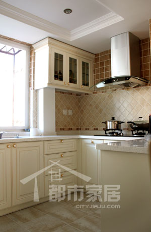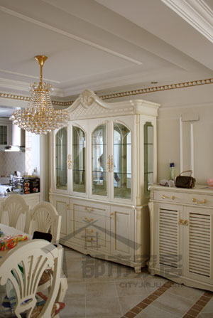 餐廳和廚房:沒有了墻體的硬性隔斷,無論是采光條件還是視覺開闊度都得到明顯改善。餐廳的奶油白歐式家具格外的精致典雅。其實(shí)在設(shè)計(jì)師的建議下,主人購(gòu)買了全套的某品牌家具,客廳和臥室也都一樣,整個(gè)房子看起來風(fēng)格相當(dāng)統(tǒng)一。