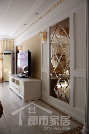 客廳:得到延伸的電視背景墻不再有門,中間是米黃色印