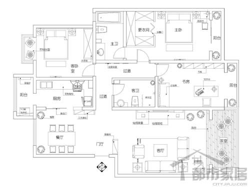 這是改造完成的平面布置圖,能夠看到各功能區(qū)域劃分非常明確。三居室的空間對(duì)于一對(duì)新婚夫婦來(lái)說(shuō)是足夠用了,考慮到男主人喜歡看書(shū)的特點(diǎn),設(shè)計(jì)師建議業(yè)主減少一間臥室,將次臥中的一間改為書(shū)房,這樣合理的建議立即得到了業(yè)主的認(rèn)同。