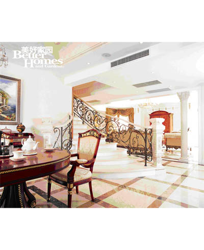正常的樓梯踏步高度為16 厘米,設(shè)計師將其改為12 厘米,降低高度,拉寬踏步,以人為本的設(shè)計,使用更加舒適。將樓梯整體延長,開端的喇叭口設(shè)計成就大氣尊貴的風(fēng)范。