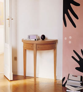 條案:在條案上放個與其風格一致的小木柜,比如弧形實木小柜,不但為簡單的條案帶來些生氣,還能增加玄關的收納作用。如果不用條案,在玄關倚墻而立放個小臺桌;如果玄關空間夠大,選用圓弧形的壁桌則更顯華貴。