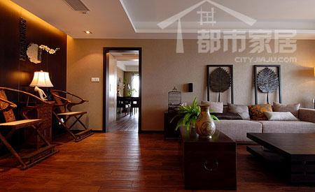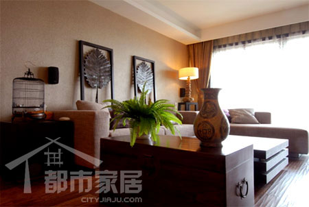 客廳古香古色的陳列品是最大的亮點。近處帶一對銅耳的老式木箱、彩陶花瓶、竹制鳥籠都是典型的中式風(fēng)格配飾。遠一點的亞麻色沙發(fā)和幾何形茶幾屬于現(xiàn)代簡約風(fēng)格。相近的顏色讓跨越時代的兩種風(fēng)格完美結(jié)合在了一起。