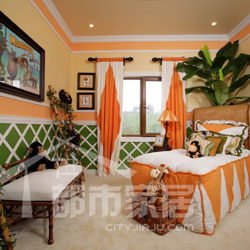 這套案例的設計靈感來自《馬達加斯加》。首先從在色彩上,設計師著重選用了綠色、米色和橙色,綠色代表電影中叢林的顏色,米色代表小島的海灘,而橙色代表的則是那里燦爛的陽光。兒童房里米色的地毯就是海灘,綠色墻裙就是綠色叢林,而頭頂天花板就是橙黃色的陽光,這色彩搭配得是不是非常貼切呢?