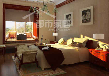 主臥延續(xù)了客廳、餐廳的風(fēng)格,壁紙加裝飾畫裝飾的墻面大方不單調(diào),曲線感十足的床尾凳散發(fā)著淡淡貴族的氣質(zhì),紅褐色的木地板烘托起成熟穩(wěn)重的氛圍。