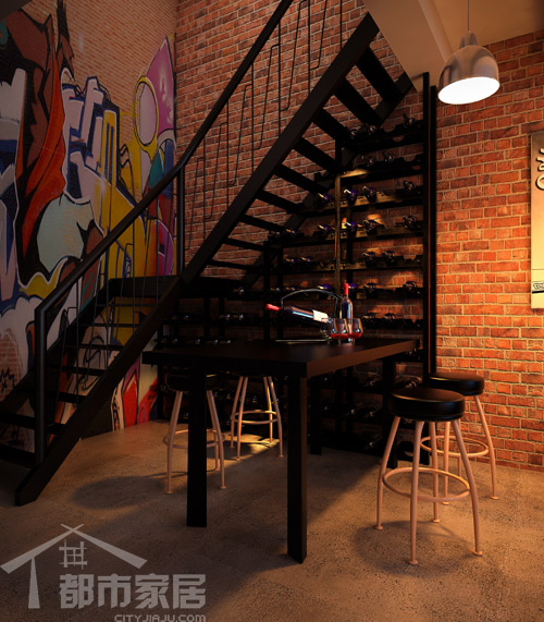 樓梯、酒架、餐桌,幾個黑色的點形成了一個面,與圖一中的沙發(fā)一前一后呼應(yīng)起來,不會使空間因為一頭黑色面積過大而產(chǎn)生一頭沉的感覺。