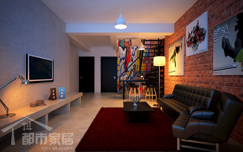 進入這個空間最為醒目的要數(shù)電視背景墻和沙發(fā)背景墻的對比了:一面是單一色彩單一形式的灰色墻面,另一面則是排列密集的磚紋墻面。通常家庭裝修都是使用磚紋壁紙來做裝飾,但是該空間的磚面可是一塊塊磚砌起來的。設(shè)計師說到作用有兩點:第一就是堵門,磚墻后就是可以通到隔壁的門。第二點:雖然都是磚紋的效果,但是壁紙遠比不上磚塊壘砌效果來的強烈。