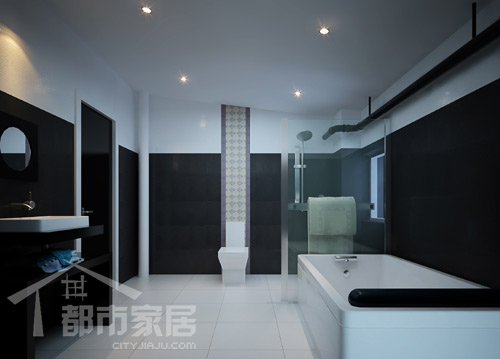 衛(wèi)生間商務(wù)味道濃厚,整個空間設(shè)計非常的大氣。潔具外形相當(dāng)?shù)木?,少而精,這點保持了其它空間的設(shè)計特點,但空間畫面看起來還是相當(dāng)?shù)呢S滿。黑白色的搭配從視覺上將空間一分為二,非常明確。是使用商務(wù)主義很好的體現(xiàn)。