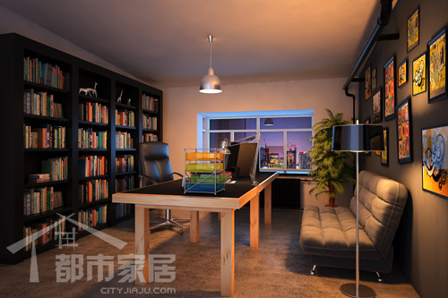 二層書房的設(shè)計沿襲了一層涂鴉風(fēng)格路線,設(shè)置了很多的小幅裝飾畫。雖然單幅畫面色彩、形式都十分跳躍,但以深灰色作為底色,又很好的把裝飾畫統(tǒng)一在墻面之上。