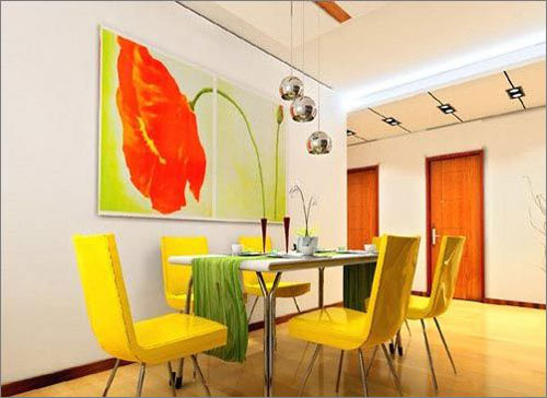 新造型閃亮登場(chǎng):艷麗的大型掛畫一掃蒼白氣氛,黃艷艷的椅子填補(bǔ)了色彩的空洞,別致的吊燈帶來幾分靈動(dòng),充滿希望的青綠色桌布令人食欲大開。