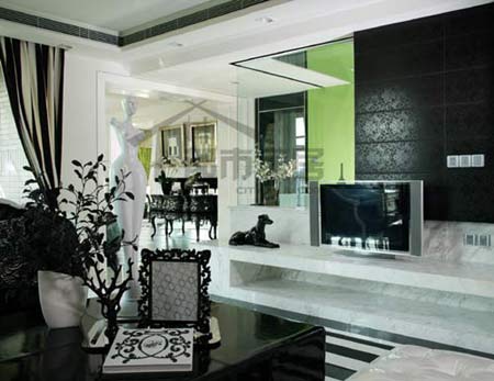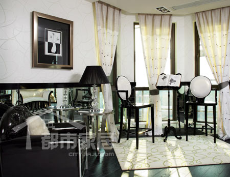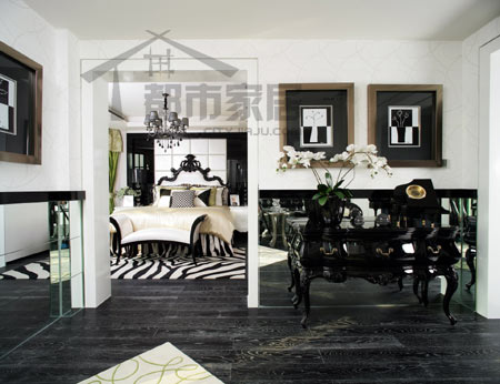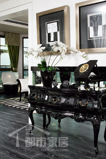 走近一看,這件精美家具原來是一件表面為鋼琴烤漆的黑色法式條案,它的曲形線條極為優(yōu)雅,上面的雕花也相當(dāng)精巧,在它上面擺放的是一個三角鋼琴音樂盒和一盆素凈的白蘭花。設(shè)計師告訴我們鋼琴暫時還沒有擺放進來。