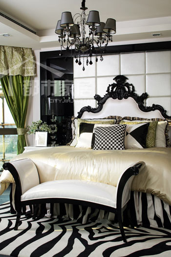 再往里走就到了主臥。雙人床的造型復(fù)古而典雅,床頭的靠背高聳,雕花精巧,凸顯高貴的氣質(zhì)。背景墻由軟包方格裝飾而成,凸顯了主臥柔和而華貴的氛圍。床尾地面的印花地毯像極了斑馬紋,透著一絲原野的風(fēng)情。設(shè)計師告訴小編,這種歐式床的高度比我們國內(nèi)的床要高不少呢:“我們常見的睡床高度在40cm左右,而這張床的高度則達到了60cm以上。因為高床看起來氣勢更盛,可以彰顯主人的高貴地位。歐洲宮殿里的古式床比這張床高得多了,有的甚至需要在床邊安放一個小樓梯,主人才可以爬上去,這大概就是所謂的“高床暖枕”吧!”