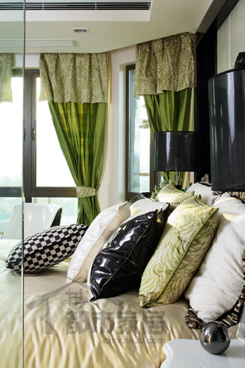 床上碼放了各色靠包,有漆皮的,棉的和絲光面料的,不同材質(zhì)搭配在一起別有風(fēng)情