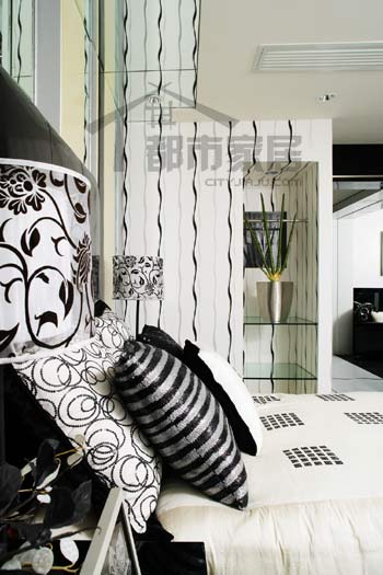 墻面上的小波浪圖案壁紙為次臥帶來了童趣十足的生動氣氛。并且這種黑白曲線在靠包和床頭燈罩上也得到了呼應(yīng)。