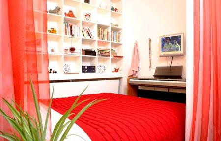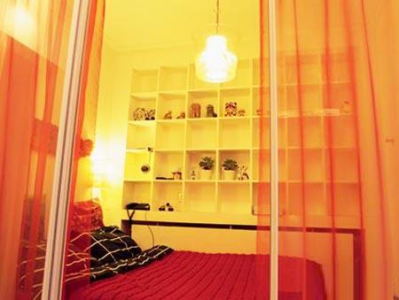 紅艷艷的臥室,寒冷的季節(jié)比較適合,夏天換換窗簾、床品就可以了。