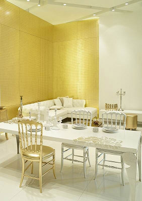 其中,金銀的光澤由于牽連著實(shí)物的價(jià)值,比較容易獲得解釋。值得注意的是人們檢驗(yàn)金銀的標(biāo)準(zhǔn),即“成色”,所考究的是它們的純度,猶如人們檢驗(yàn)一個(gè)人的品質(zhì)或者出身,或者諸如此類的問題一樣。尤其自近年以來,純用金色或銀色,而不是將它們拿來做鑲邊的做法日趨流行,當(dāng)然可以說這是金融危機(jī)之下人們尋求補(bǔ)償心理的某一側(cè)面反映,卻也可以說是在一個(gè)變幻而浮華的世界里,人們重新回到了古老的永恒品質(zhì)的路途上。不管怎么說,還有什么能比真金白銀更無需修飾、無需任何其他的附加物,自己便能證實(shí)自身的價(jià)值呢?