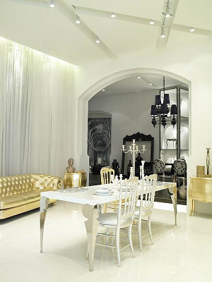 在新開幕的JIA concept尊家家居的旗艦店內(nèi),只設(shè)黑、白、金、銀四個(gè)展示區(qū),復(fù)古風(fēng)格家具在這四種色調(diào)下看起來好似一幅幅現(xiàn)代摩登場(chǎng)景。眩目的金銀光澤帶來富有沖擊力的奢華視覺;黑與金的沖撞,帶著些許妖媚;而柔美、安嫻的白色,褪去了金銀光澤中的世俗煙火氣,略加少許淡藍(lán)色的點(diǎn)綴,幾乎呈現(xiàn)出某種天使般的圣潔氣息。