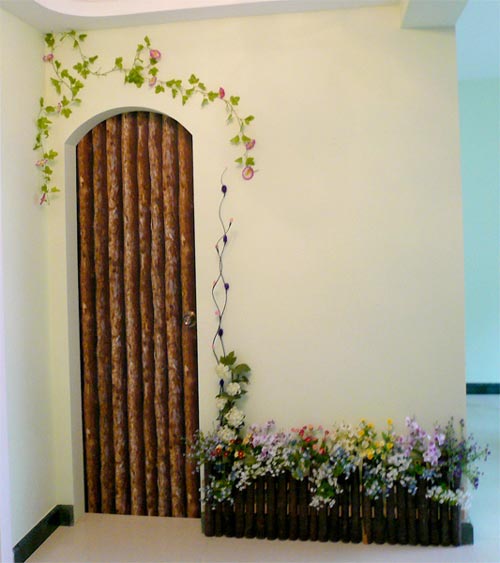 這個(gè)花園的木門(mén)上喇叭花調(diào)皮的盤(pán)上了木門(mén),貼上了木紋的墻紙,就成了花園里的木門(mén)