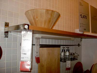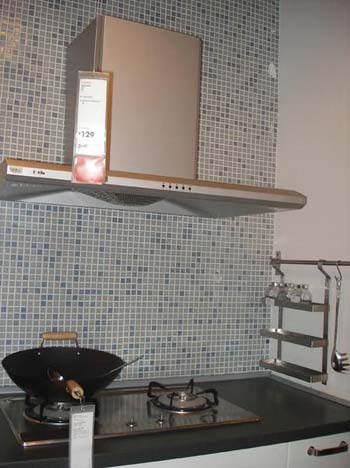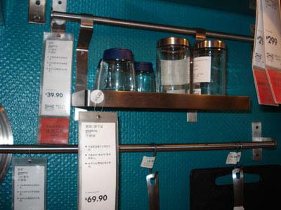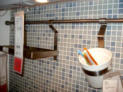 另一面墻上的掛桿,微波爐手套、圍裙等廚房用品就可以掛在這里,方便又整潔。這個(gè)掛鉤的價(jià)錢也不貴,僅花14.9元就可以在宜家里買到。