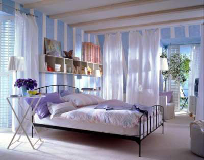 這間絕對(duì)是瓊瑤女主角的臥室哦!白色和紫色的搭配,還有飄逸的窗簾。墻壁好像用的是藍(lán)白條紋的壁紙。非常清爽的搭配!
