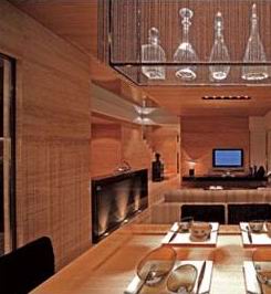 無須硬性劃分,只是通過燈光的不同效果就可以暗示出不同的功能區(qū)。餐桌上強烈的射燈光線透過玻璃與水晶瓶散落在桌上,光影錯落,形成獨特的效果。