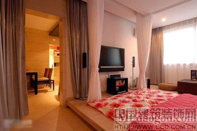 在擺放床的地域處,裝修出10公分左右高的木質(zhì)地臺(tái),相應(yīng)地選用較低矮的床。其效果是:使睡眠區(qū)的環(huán)境更為清潔;地臺(tái)烘托中的床與人更有一種“精品”的藝術(shù)美感;尤其是花梨木質(zhì)的地臺(tái)還可給人以芬芳的氣息。