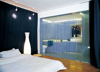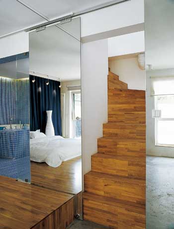 當(dāng)初選擇這套公寓,一是看中了小區(qū)規(guī)劃真正實現(xiàn)了人車分流,綠化景觀不錯。另外,就是這套住宅戶型方正,結(jié)構(gòu)干凈,利于重新改造。在原有的設(shè)計中,一層格式是十分普通的兩居室,北向為廚房和小臥室,南向為起居室和主臥室。南北之間是完全封閉的衛(wèi)生間、餐廳和起居室聚在一起,從廚房端著菜盤要經(jīng)過較長的路線才可到達餐桌。一部兩跑樓梯直通到半地下空間,這里有一廳與一間臥室,外加一個面積很小的衛(wèi)生間。原設(shè)計最大的缺點在于所有的房間都被隔墻分開,彼此孤立,三個臥室中卻沒有一個擁有獨立的衛(wèi)生間,樓梯占據(jù)了很大空間,缺少儲藏空間。