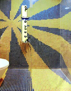 這張劉設(shè)計師展示給我們的衛(wèi)生間效果圖看起來實在夠獨特。墻面的馬賽克鋪貼得像一朵正在盛開的菊花一樣,設(shè)計師解釋說:“這就是我的秘訣所在了。張開的花瓣造型在視覺上有極強的擴張力,讓我們幾乎感受不到這個空間的局限和束縛。之所以選用黃色和藍(lán)色也是因為它們的對比效果比較明顯,能給人明亮潔凈的印象,比較適合衛(wèi)生間。”原來是這樣?。看蠹以谛蕾p這個風(fēng)格鮮明、個性突出的衛(wèi)生間時,是不是忘記了它4平米的真實大小呢?