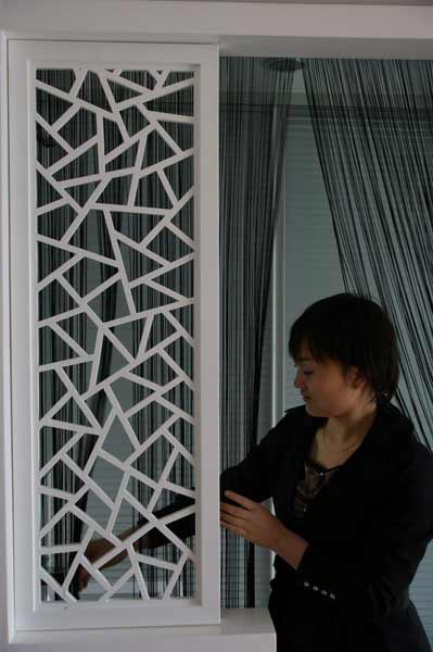 為了舒緩小空間帶來的壓抑感,我們應該選擇通透感相對更好的材質,比如在這套小戶型的設計里,衛(wèi)生間和客廳之間的隔斷是白色窗格,陽臺和客廳之間的隔斷是黑色垂簾,臥室里的衣柜門用的是半透明的玻璃材料等