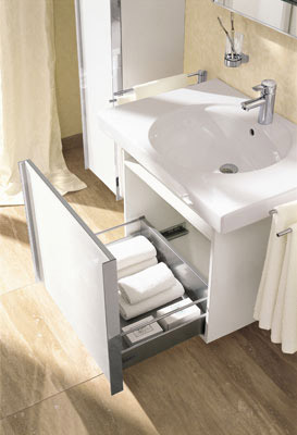 ●充分利用洗臉池下面的空間。可以在其中設計一個儲物柜,放入毛巾、牙刷、牙膏、及各式洗浴洗頭用品,也可以用來儲存衛(wèi)生紙和衛(wèi)生巾。安排這樣的儲物方式,能夠保證衛(wèi)浴空間必需的干濕分離。