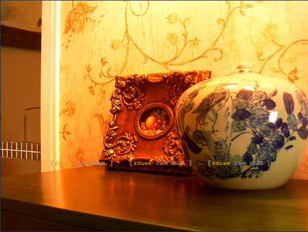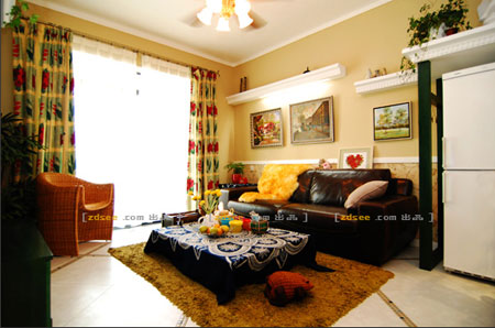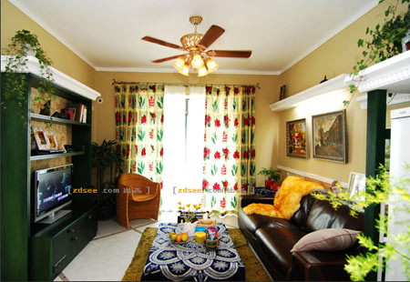 客廳中設(shè)計(jì)了幾段眉檐,它們并沒(méi)有連綿不斷,而是錯(cuò)落有致的斷開(kāi),制造了一種殘?jiān)珨啾诘囊饩?。沙發(fā)旁的冰箱上方設(shè)計(jì)成涼亭狀,恰似戶外花園的景致。墨綠色的家具,有點(diǎn)復(fù)古,有點(diǎn)張揚(yáng),又有點(diǎn)刁巧,仿佛讓人感覺(jué)回到了原野上。客廳的吊扇燈,復(fù)古的精致雕花,展現(xiàn)優(yōu)雅、細(xì)膩的風(fēng)情。