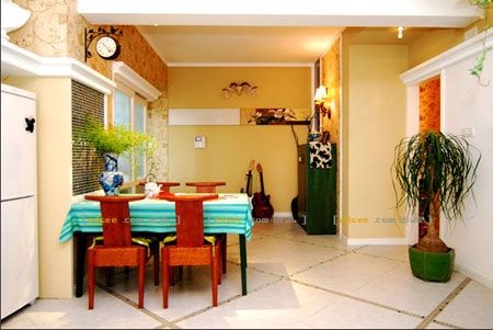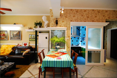 廚房門(mén)口便是餐廳,鋪上綠色條紋桌布,再配上藤藤制餐椅和花瓶,營(yíng)造了清爽舒適的環(huán)境。墻壁鋪貼了鏡子馬賽克,人在家中的活動(dòng)都能在鏡中顯現(xiàn),使居室有動(dòng)感和生機(jī)。