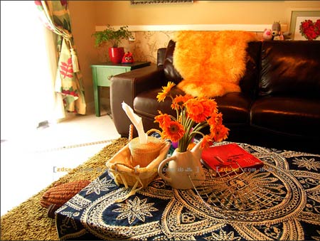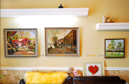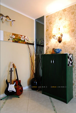 餐柜旁的空地是一塊休閑區(qū)域,擺放了吉他和一些收藏品。墻上的花朵妖嬈纏繞,餐柜的放置賦予沉穩(wěn)的氣質(zhì),墻上的壁畫(huà)用來(lái)巧妙地遮擋配電箱,羚羊角展現(xiàn)了神圣的味道。