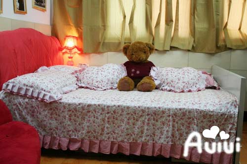 臥室,舒服的花床。床上四件套都是俺親自手工縫制的,額滴神啊,手都發(fā)麻了。