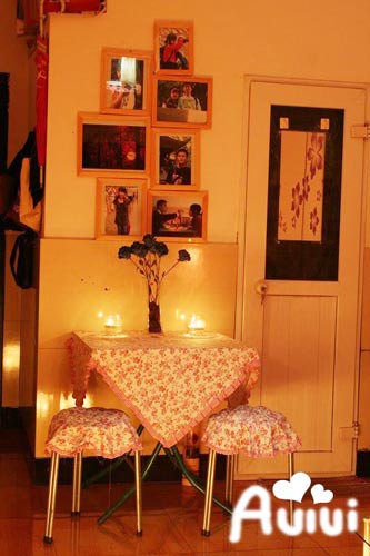 餐廳,無(wú)一幸免,所有的東西都穿上了漂亮的小碎花布。花瓶里的藍(lán)色妖姬是用紙疊的,上大學(xué)時(shí)在風(fēng)信子學(xué)的。嘻嘻,偶爾來(lái)個(gè)燭光晚餐,屋雖小生活卻也溫馨浪漫。