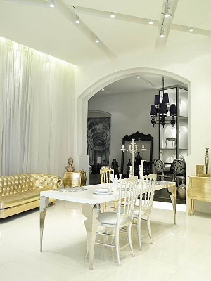 在新開幕的JIAconcept尊家家居的旗艦店內(nèi),只設黑、白、金、銀四個展示區(qū),復古風格家具在這四種色調(diào)下看起來好似一幅幅現(xiàn)代摩登場景。眩目的金銀光澤帶來富有沖擊力的奢華視覺;黑與金的沖撞,帶著些許妖媚;而柔美、安嫻的白色,褪去了金銀光澤中的世俗煙火氣,略加少許淡藍色的點綴,幾乎呈現(xiàn)出某種天使般的圣潔氣息。