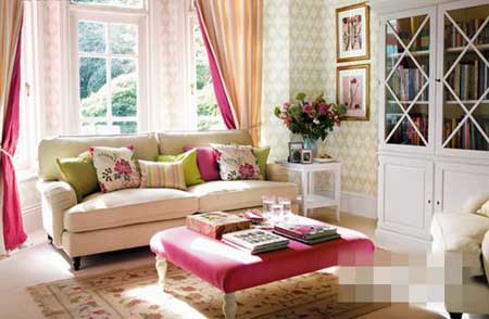 為平淡的空間加入一至兩種主題色彩,能迅速獲得驚艷的效果。有了顏色作為裝飾主線,無(wú)需再加入過(guò)多的配飾。如果房間里的輔助色彩用于墻面等大面積裝飾,那么主題顏色的使用面積就要相對(duì)小些。比如這里的粉色沙發(fā)凳,還有雙面窗簾中隱約出現(xiàn)的粉色??傊?,主題色不能超過(guò)整體色調(diào)的10%。用靠包、鮮花等與主題色相呼應(yīng),令空間造型更顯完整和專業(yè)。