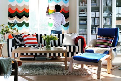 After:沙發(fā)套更換成了黑白色,符合這個(gè)空間現(xiàn)代簡(jiǎn)約的特征,非常完美地搭配了波浪紋的彩條窗簾和條紋圖案的靠墊。黃色、橘色的點(diǎn)綴恰到好處,也使房間亮麗起來(lái)。雖然顏色眾多,但感覺(jué)很和諧,這是因?yàn)樗械念伾寄茉诖昂熒险业健?/P>
