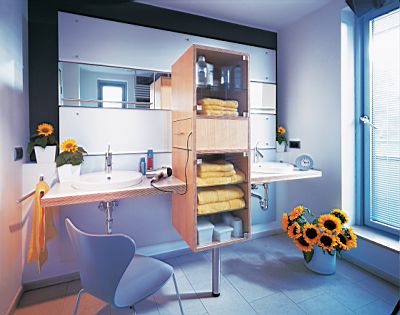 浴室家具尺寸不大,卻可以將衛(wèi)生間常用的瑣碎之物洗面乳、牙刷杯、剃須刀等都巧妙地隱藏在鏡子的后面,同時也可以將其他使用周期稍長的洗滌清潔用品整齊地收藏在面盆下面的小柜中。加上整體的鏡面設計,可以拉伸出成倍空間感。