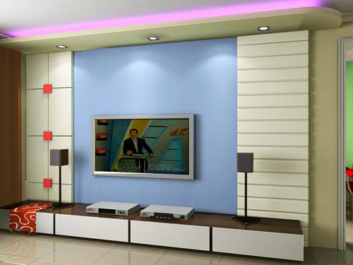 過(guò)去最常見(jiàn)的方法是電視墻與客廳的其他部位一樣,在電視旁邊配以一組矮柜,墻壁采用彩噴、墻紙、墻布等。彩噴多采用具有防潮、防霉、可洗、耐熱等效能的涂料,而市場(chǎng)上的墻紙、墻布有多種花紋、圖案,非常溫馨、溫暖。