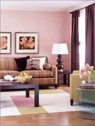粉色給人的感覺是太**,不容易搭配。其實深棕色的家具可以很好的融入其中,不過家具的線條一定要簡潔,否則會讓客廳顯得太過于復(fù)雜。