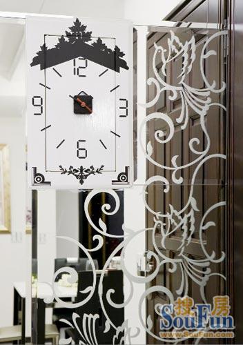 鏡面的應(yīng)用拉大了空間視覺(jué)感受,時(shí)尚的花紋彰顯出貴族品味。內(nèi)嵌的鐘表巧妙的將“時(shí)間”變?yōu)檠b飾,為嚴(yán)肅的格調(diào)增加了活潑的味道。