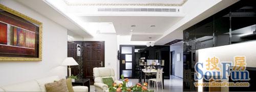 客廳全景,幾何形吊頂設(shè)計(jì),拉伸了房高感覺(jué),線條利落簡(jiǎn)潔。黑白對(duì)比的色彩酷勁十足。