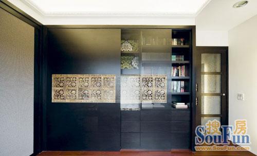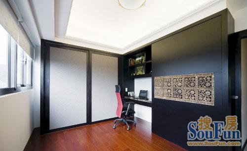 工作間大方時(shí)尚,柜門(mén)上的傳統(tǒng)鏤空裝飾彰顯了主人的文化品味。深色空間的凝重被幾處跳色渲染出溫暖氣息。