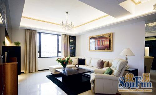 從陽(yáng)臺(tái)看向客廳:白色沙發(fā)與黑色烤漆的電視柜形成色彩呼應(yīng)。墻壁上的時(shí)尚畫(huà)框渲染出空間的熱鬧。