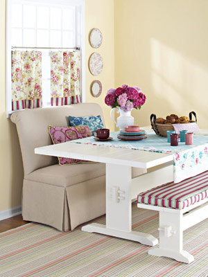 這個色彩繽紛的小休閑區(qū)是不是讓你心情大好?仔細看一看,其實空間本身的色調很中性化,用了淺褐色的家具和淡雅的黃色墻面。裝飾的重點在于那些表面布滿了花紋的的小配飾,天藍、紫紅、粉紅、淺綠……讓整個空間格調煥然一新,充滿女人味。