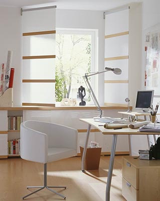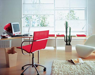 為了直接利用自然光源,我們可以把工作區(qū)安排在窗前,如果是朝南的房間,光線會比較強烈,我們要么用窗簾調(diào)節(jié),要么把工作區(qū)側(cè)放或靠后。但是我們應該考慮到電腦屏幕的反光問題,而把位置安排在窗戶兩側(cè),離窗稍遠的墻邊。不過對于遠離窗口的空間,由于光線比較暗淡了,我們最好用來安排輔助區(qū)的活動。